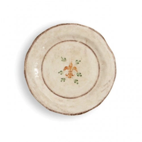 The gentle cream color of this plate is accented with a beautiful, hand-painted fleur-de-li and vine motif in rich hues of green, blue and orange. The uneven edges and subtle colors add to the old world look. Italian ceramic, Hand made in Italy.