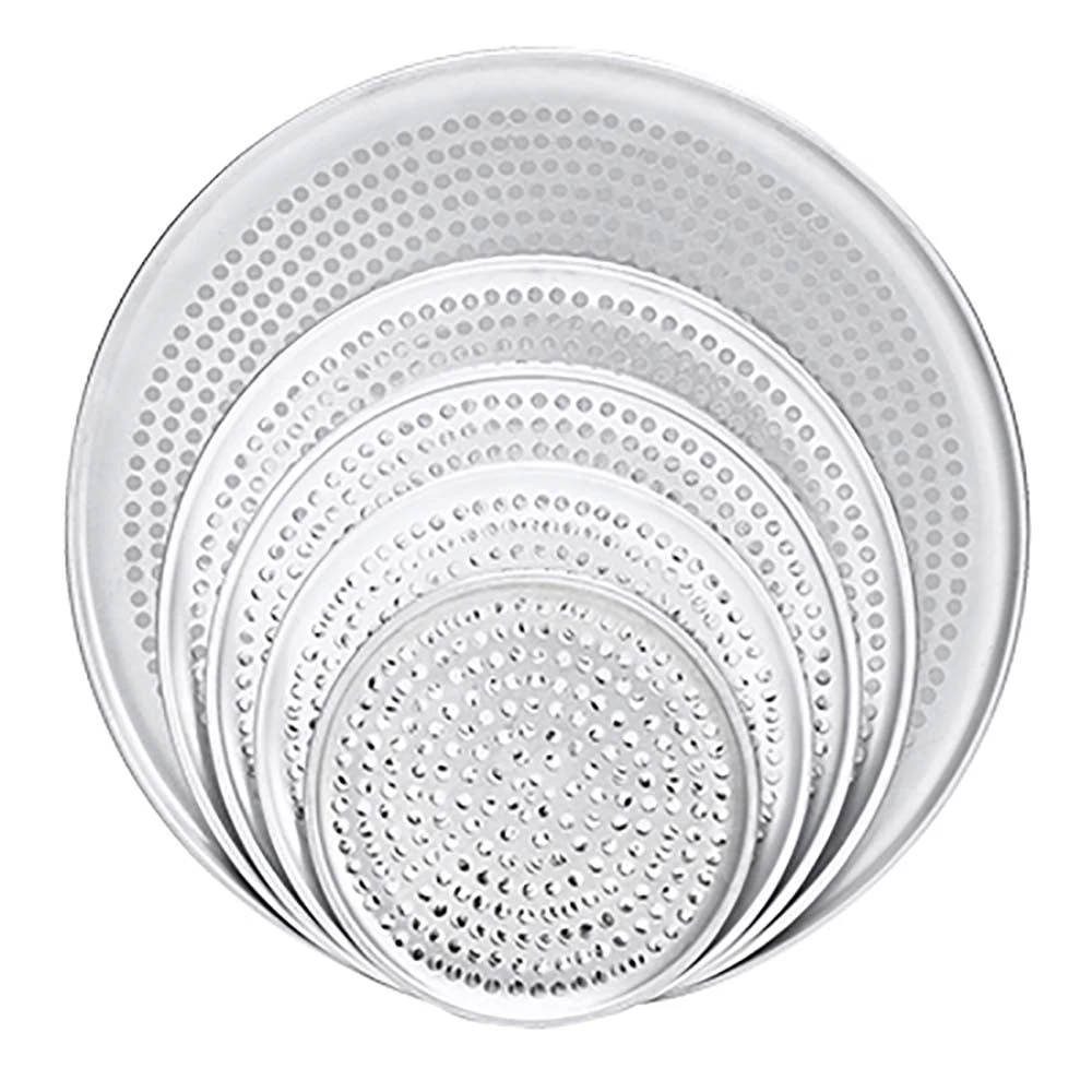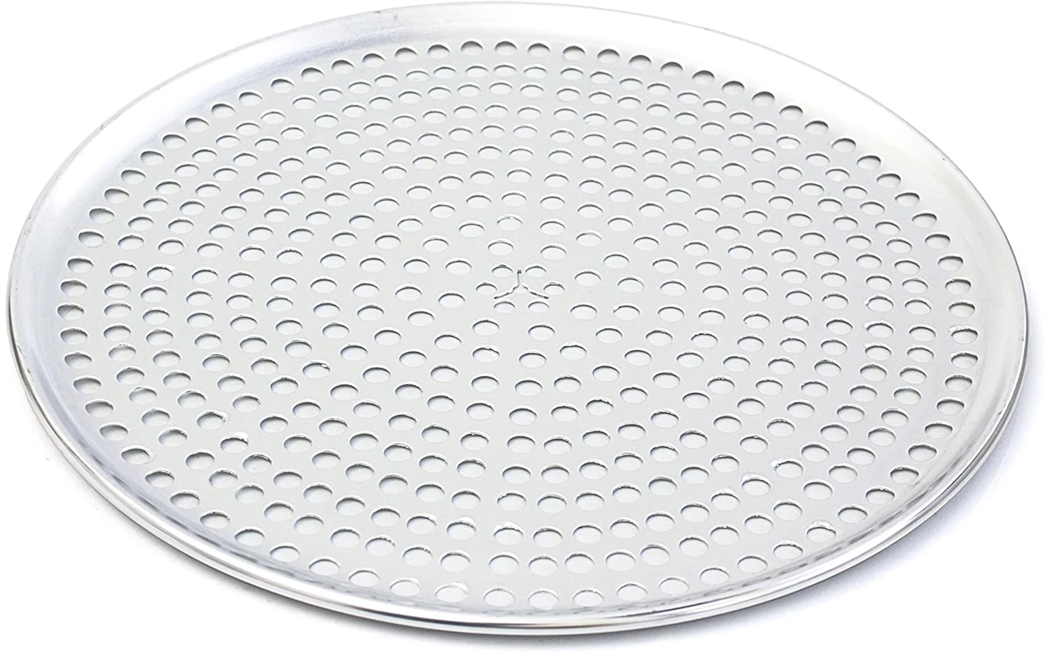 Professional aluminum pizza plate with perforations that ensure more even circulation of air under the crust. Heavyweight, 18-gauge, 1mm metal won’t warp and heats evenly, producing a crisp crust every time.