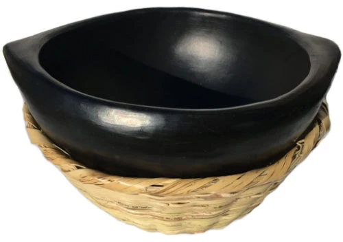 Cook and serve your favorite vegetable soup, beef stew, or classic rice dish in the handcrafted ajiaco bowl with basket. This Colombian black clay soup bowl was designed based on the traditional piece used for ajiaco, and features curved edges for easy carrying from the stove or oven to the table. The versatile bowl is also great dinnerware to use for side dishes or to reheat leftovers, and is a must-have piece for your collection.