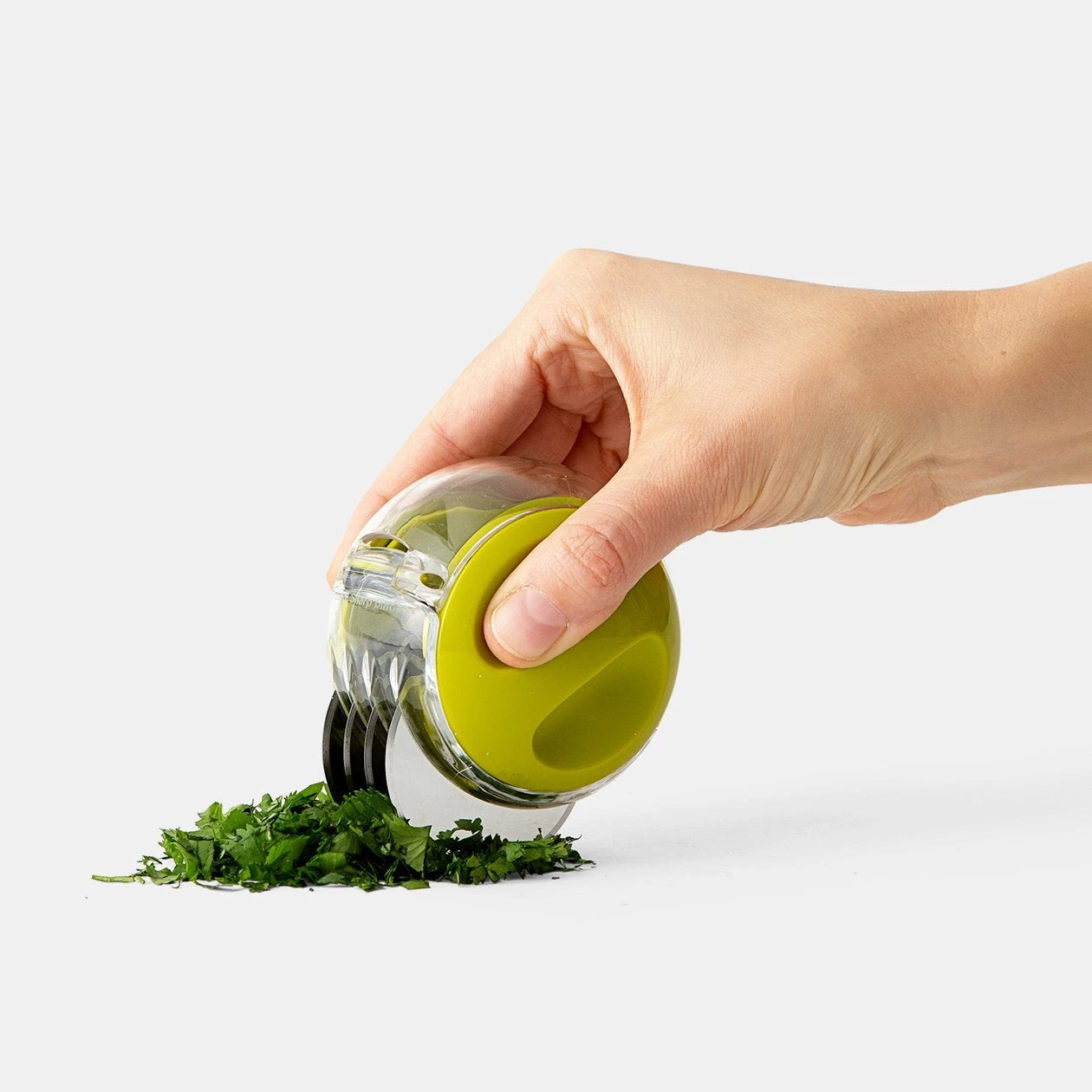 The Herb Zoom fits in the palm of your hand and rolls to mince fresh herbs without bruising them. Turn the dial on the side to expose blades for mincing, retract blades for safe storage.