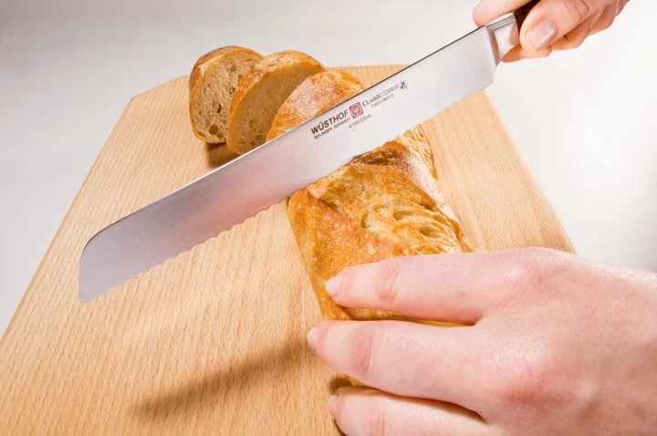 The Classic IKON 9″ Bread Knife slices through bread or baguettes with minimal crumbs. The serrations along the edge help guide the blade through tough crust without compressing the soft inside.Â