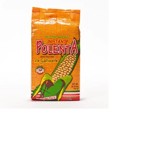 La Gallinella’s Instant Polenta is a finely ground cornmeal which can be made into a creamy, hearty side dish in a matter of minutes! Stir in butter and grated parmesan, or even gorgonzola, into the hot polenta and serve as a base to any stewed, braised or roasted meat or poultry. For an even creamier polenta, one you can eat for breakfast, you should add some heavy cream towards the end of cooking, then garnish with honey, toasted almonds, fresh berries or jams. Or, simply pour the hot polenta into a sheet tray, cool, then cut into squares. Fry until brown and crispy, or bake/grill and top with caramelized onions, sauteed mushrooms and melted fontina cheese.