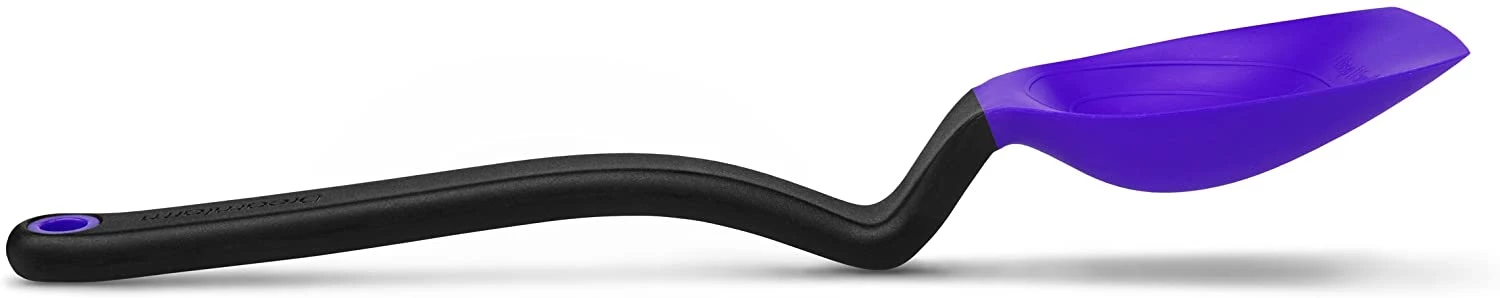 The Suppoon has a flat squeegee tip and flexible sides to scrape your pan or bowl clean, a deep scooping head, measures teaspoons and tablespoons, and its clever handle design is like having a built-in spoon rest so your Supoon’s head sits up off your bench.